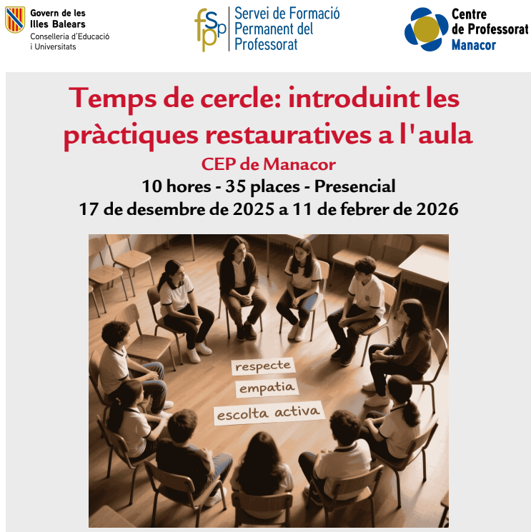 - Aprovació de la sol·licitud de formació de Trobada Pedagògica proposada per l’IES Manacor, amb títol “Temps de cercle: pràctiques restauratives”.