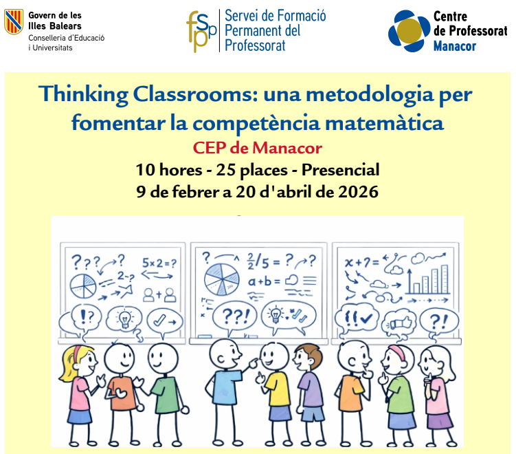 Thinking Classrooms: una metodologia per fomentar la competència matemàtica administrador16/01/26 Enllaç a la convocatòria Podeu fer la inscripció al portal del personal de dia 12 de gener a dia 1 de febrer de 2026.