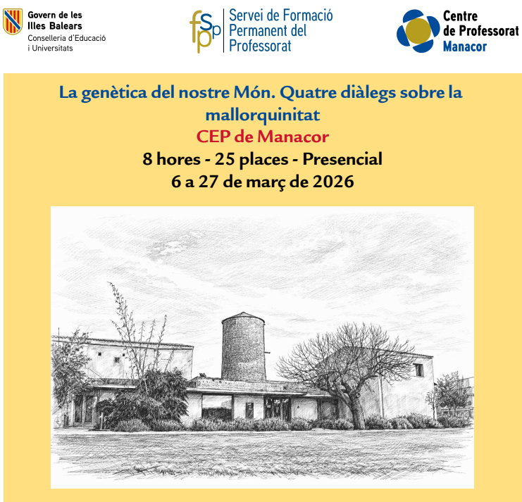 La genètica del nostre Món. Quatre diàlegs sobre la mallorquinitat administrador10/02/26 Enllaç a la convocatòria Podeu fer la inscripció al portal del personal de dia 10 de febrer a dia 01 de març de 2026.