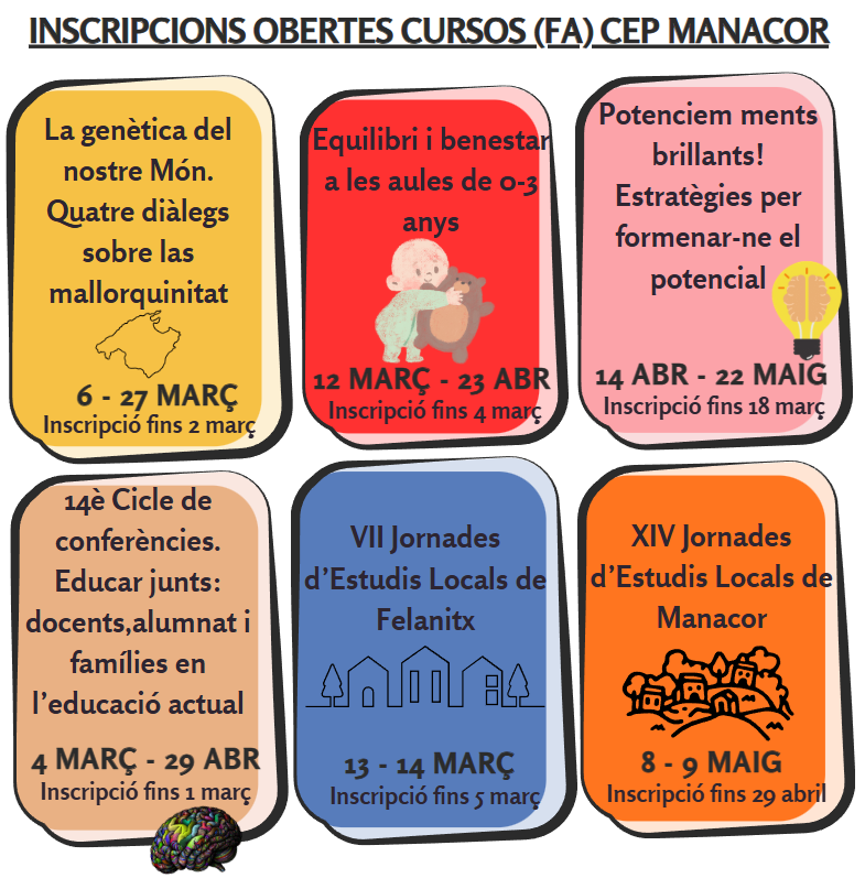 Aquí teniu el cartell del 14è cicle de conferències organitzat pel CEP de Manacor, on hi apareixen els formadors, l’horari i el lloc de trobada, així com les temàtiques tractades. Teniu en compte que la inscripció ja està oberta al portal del personal i que hi romandrà fins el 26 de febrer. No perdeu aquesta oportunitat i afanyeu-vos a inscriure-us!