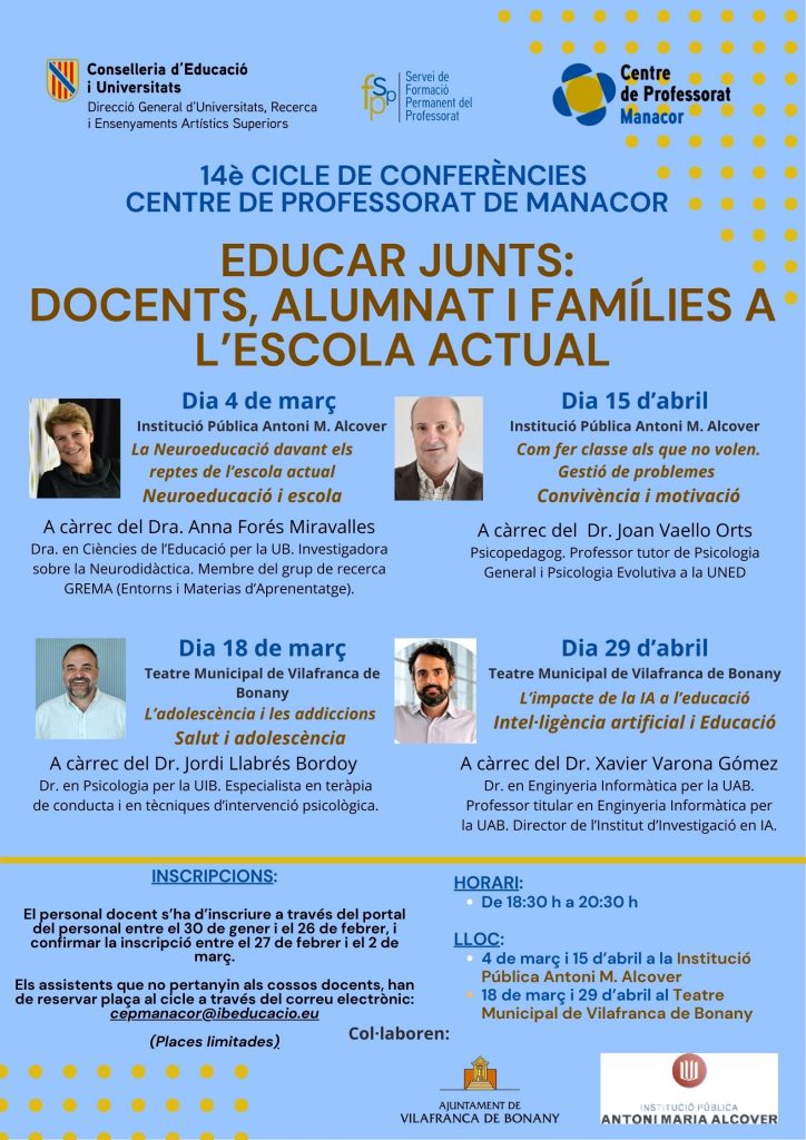 Aquí teniu el cartell del 14è cicle de conferències organitzat pel CEP de Manacor, on hi apareixen els formadors, l’horari i el lloc de trobada, així com les temàtiques tractades. Teniu en compte que la inscripció ja està oberta al portal del personal i que hi romandrà fins el 26 de febrer. No perdeu aquesta oportunitat i afanyeu-vos a inscriure-us!