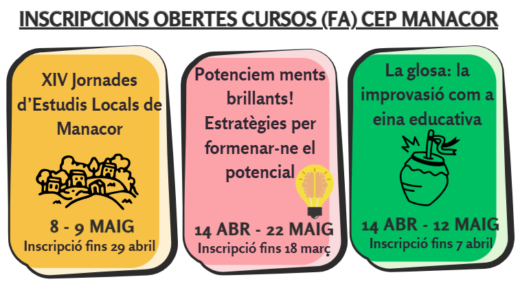 Aquí teniu el cartell del 14è cicle de conferències organitzat pel CEP de Manacor, on hi apareixen els formadors, l’horari i el lloc de trobada, així com les temàtiques tractades.