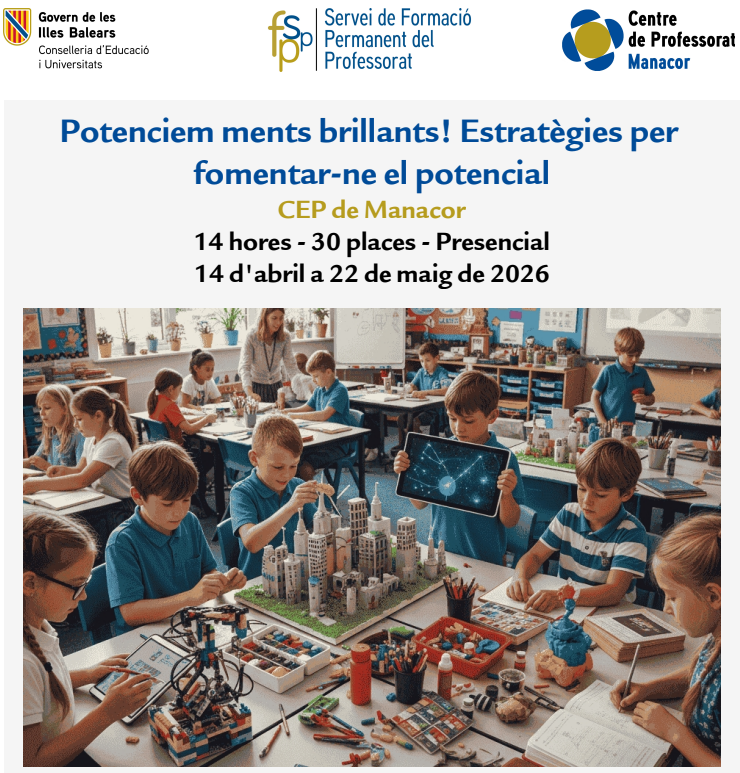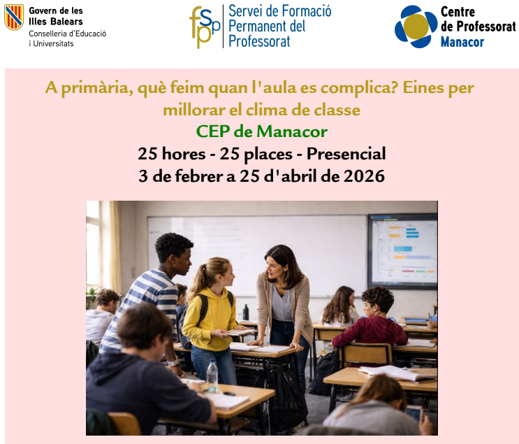 A primària, què feim quan l’aula es complica? Eines per millorar el clima de classe administrador09/01/26 Enllaç a la convocatòria Podeu fer la inscripció al portal del personal de dia 9 a dia 25 de gener de 2026.