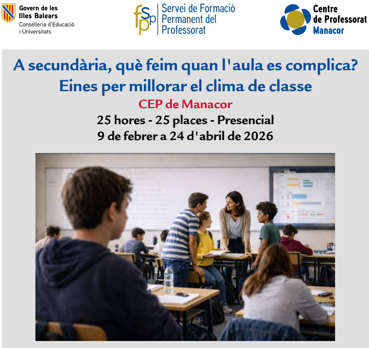 A secundària, què feim quan l’aula es complica? Eines per millorar el clima de classe administrador09/01/26 Enllaç a la convocatòria Podeu fer la inscripció al portal del personal de dia 9 a dia 25 de gener de 2026.