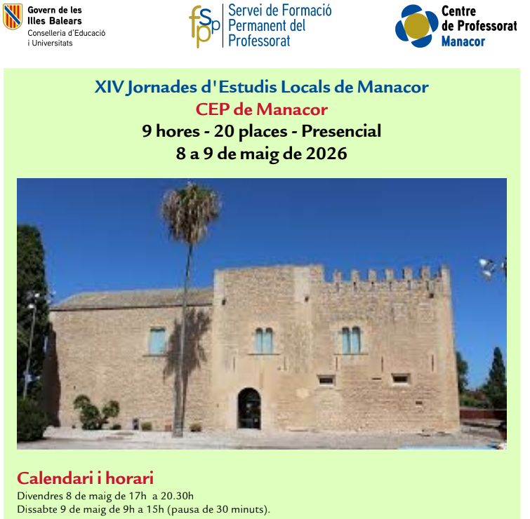 XIV Jornades d’Estudis Locals de Manacor administrador14/01/26 Enllaç a la convocatòria Podeu fer la inscripció al portal del personal de dia 19 de gener a dia 29 d’abril de 2026.